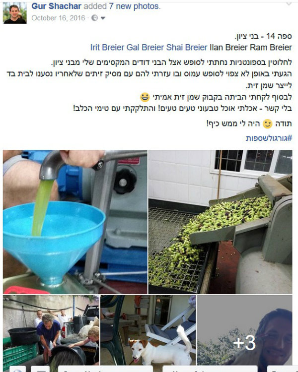 לא ידעתי שמצפה לי סופ"ש של חוויות. כשהגעתי הם סיפרו לי שמחר הם מתכננים בפעם הראשונה לעשות מסיק זיתים ולאחר מכן ללכת לבית-בד להפוך את חומר הגלם לשמן זית. שאלו אותי אם אני רוצה להשתתף. ובמסע הזה, כבר החלטתי, אני לא אומר לא. וכך יצא שמסקתי איתם זיתים מעצים שיש להם בחצר, נסעתי איתם לבית-בד וראיתי בפעם הראשונה היא יוצרים שמן זית אמיתי. ואפילו זכיתי לקחת בקבוק הביתה.